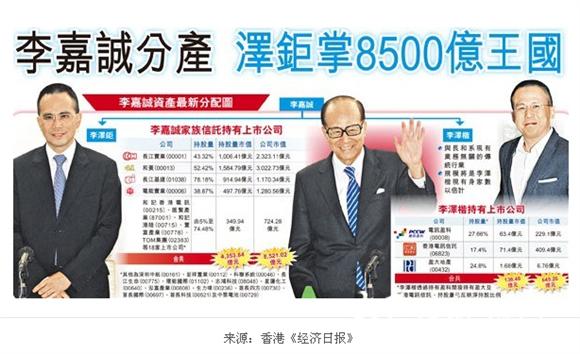 2012年5月,李嘉誠在出席旗下公司長江實業(yè)及和記黃埔股東大會后對外公布了家族資產(chǎn)分配計劃:將自己持有的超過四成的長江實業(yè)及和記黃埔股權(quán),以及約35.5%的赫斯基能源分配給長子李澤鉅,這一部分資產(chǎn)的市值約合2041億港元。而對于次子李澤楷,李嘉誠則稱將以現(xiàn)金方式全力幫助其收購心儀的目標公司。