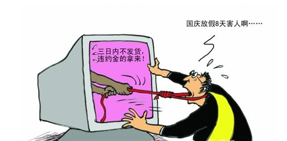 網(wǎng)店國慶七天放假歇業(yè),卻要賠償三萬多元違約金。珠海一淘寶店主自稱遭遇惡意買家,趁網(wǎng)店放假,故意拍下大筆訂單,然后利用淘寶“買家拍下訂單付款后,商家必須在3天內(nèi)發(fā)貨,否則支付成交額的30%作為違約金”的硬性條款,套取巨額違約金。(來源:南方都市報 南都網(wǎng)