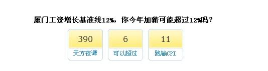 今年工資該漲多少合適?您可以試著向老板要求漲12%,這是2012年廈門市企業(yè)工資增長基準(zhǔn)線,工資合理增長區(qū)間為9%-15%。