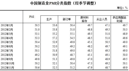 2012年11月,構(gòu)成制造業(yè)PMI的5個分類指數(shù)3升2降。