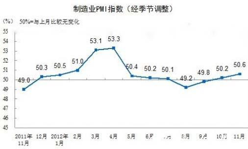 2012年11月,中國制造業(yè)采購經(jīng)理指數(shù)(PMI)為50.6%,比上月上升0.4個百分點。