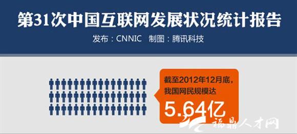騰訊科技訊(樂天)1月15日消息,中國互聯(lián)網(wǎng)絡(luò)信息中心(CNNIC)今日發(fā)布《第31次中國互聯(lián)網(wǎng)絡(luò)發(fā)展?fàn)顩r統(tǒng)計(jì)報(bào)告》(報(bào)告全文下載)。報(bào)告顯示,截至2012年12月底,我國網(wǎng)民規(guī)模達(dá)5.64億,全年新增網(wǎng)民5090萬人。互聯(lián)網(wǎng)普及率42.1%,較2011年底提升3.8個(gè)百分點(diǎn)。