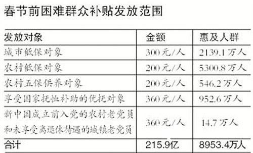 此次補(bǔ)貼發(fā)放對(duì)象和補(bǔ)貼標(biāo)準(zhǔn)分別是:城市低保對(duì)象每人300元,惠及2139.1萬人;農(nóng)村低保對(duì)象和農(nóng)村五保供養(yǎng)對(duì)象(即無勞動(dòng)能力、無生活來源、無法定贍養(yǎng)撫養(yǎng)義務(wù)人或雖有法定贍養(yǎng)撫養(yǎng)義務(wù)人,但無贍養(yǎng)撫養(yǎng)能力的老年人、殘疾人和未成年人)每人200元;享受國家撫恤補(bǔ)助的優(yōu)撫對(duì)象以及新中國成立前入黨的農(nóng)村老黨員和未享受離退休待遇的城鎮(zhèn)老黨員每人360元。此次補(bǔ)貼惠及困難群眾8953.4萬人,所需資金215.9億元由中央財(cái)政負(fù)擔(dān),并于近日下達(dá)。