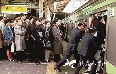 東京地鐵在高峰期,人們都是被裝進(jìn)去的。地鐵推手們在早晚高峰期把人們推進(jìn)有縫隙的車廂。當(dāng)?shù)罔F里的人超過容載量的200%的時候,地鐵的們就會關(guān)不上,但是地鐵推手會不停的推人進(jìn)入車廂。當(dāng)他們第一次出現(xiàn)在地鐵站的時候,他們被稱為乘客疏散人員,他們大多都是兼職的學(xué)生。但是現(xiàn)在,這個職業(yè)成了固定的職業(yè),有兼職也有全職。