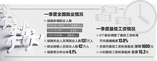 人力資源和社會保障部一季度新聞發(fā)布會透露,2013年一季度,我國就業(yè)局勢保持基本穩(wěn)定,1—3月城鎮(zhèn)新增就業(yè)人數(shù)342萬人,好于2012年同期的332萬人,更好于2011年的303萬人。