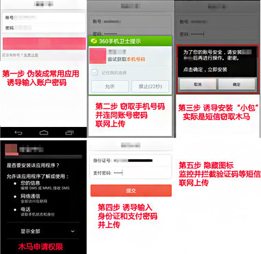 據(jù)360手機(jī)衛(wèi)士專家分析,“隱身大盜二代”相比一代木馬更為隱蔽。首先它改變了竊取短信內(nèi)容的方式,不再通過(guò)轉(zhuǎn)發(fā)短信進(jìn)行,而是采取聯(lián)網(wǎng)上傳短信到黑客服務(wù)器的方式;其次,“隱身大盜二代”采取了連環(huán)攻擊手段,在用戶安裝完偽裝成流行應(yīng)用的“大包”之后,誘導(dǎo)用戶再安裝一個(gè)偽裝成賬戶安全驗(yàn)證的“小包”,大包專門竊取賬號(hào)密碼、身份證號(hào)等,“小包”則案中監(jiān)控、識(shí)別受害者短信并聯(lián)網(wǎng)上傳。