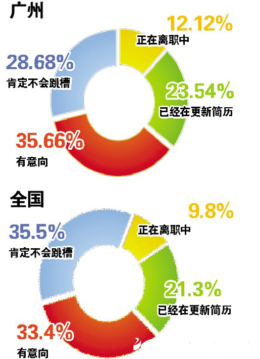 之前該機(jī)構(gòu)進(jìn)行的招聘調(diào)查就表示今年春季招聘旺季從3月份提前到2月份,而這份針對(duì)廣州白領(lǐng)的報(bào)告指,已經(jīng)有12.12%的白領(lǐng)正在辦理入職/離職手續(xù),有23.54%已經(jīng)在更新簡(jiǎn)歷;而有意向的白領(lǐng)占到了35.66%,肯定不會(huì)跳槽的比例僅為28.68%。跳槽或有意向跳槽的比例都比全國(guó)的平均水平高。全國(guó)數(shù)字顯示,目前正在辦理入職/離職的比例占到了9.8%,已經(jīng)在更新簡(jiǎn)歷的白領(lǐng)占到了21.3%;而有意向的白領(lǐng)占到了33.4%,肯定不會(huì)跳槽的比例為35.5%。
