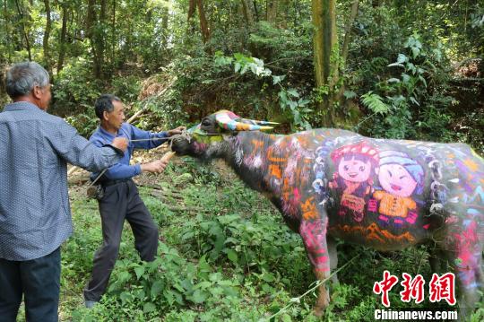 在茶山田埂間,記者看到耕牛頭戴大紅花悠閑地東張西望。不僅如此,牛身上涂著畬族刺繡風格的彩繪,溫順的耕牛,吸引眾多游人上前拍照。