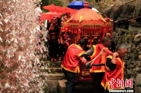 伴著鑼鼓聲聲,在分會場之一,硤門畬族鄉(xiāng)秦石村石蘭古堡,一場畬族傳統(tǒng)婚嫁儀式正在上演。迎親、哭嫁、拜堂、鬧洞房……身處深山中的畬族人,用自己古樸的方式,男娶女嫁,一代代繁衍傳承,在大山的懷抱中,譜寫著浪漫動人的幸福樂章。