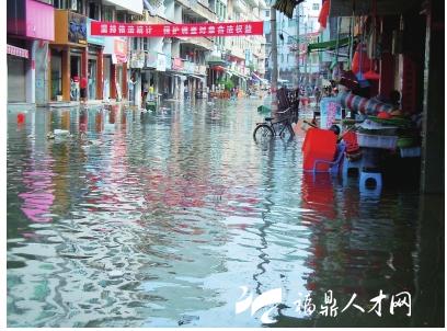 昨天,沙埕鎮(zhèn)鎮(zhèn)中心最熱鬧的興港路、臨海路等4條街道全部被淹,80多家商鋪、200多棟民房進(jìn)水,2000多人日常生活受影響,整個(gè)沙埕鎮(zhèn)一半成汪洋。