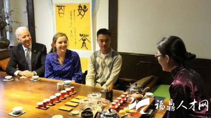 據(jù)美國駐華大使館微博透露,12月5日下午,在訪問中國期間,美國副總統(tǒng)拜登,駐華大使駱家輝和他們的家庭成員在一家中國傳統(tǒng)茶館品嘗白茶和大紅袍。他們買了一些茶和山楂糕帶回美國。另外據(jù)消息,美國貴賓品嘗的是福鼎產(chǎn)的白毫銀針。圖為美國副總統(tǒng)拜登與孫女向茶藝員了解中國茶情況。
