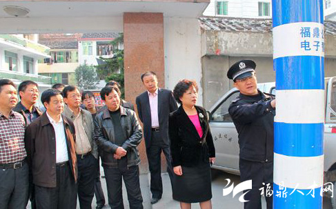 歐陽秋虹(右2)察看報警桿現(xiàn)場演示