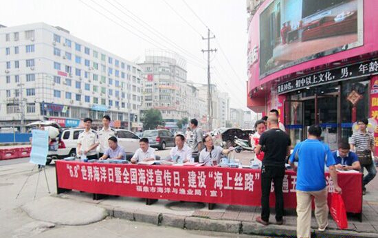 6月8日,福鼎市海洋與漁業(yè)局在城區(qū)主干道沿街設攤開展海洋日宣傳活動。在活動開展前,我局共制作漁業(yè)安全、漁業(yè)互保、水生野生動物保護、海洋防災減災、涉海涉漁法律法規(guī)等各類宣傳單、宣傳冊近萬份。為擴大宣傳活動影響面,6月6日我局在《福鼎周刊》刊登了以“建設‘海上絲路’,聯(lián)通五洲四?!睘橹黝}的整版專題報道。同時,為增強群眾參與宣傳活動的積極性,我局還訂制了水杯、削皮刀、雨傘等宣傳紀念品。