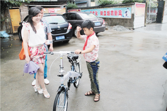 “沒想到我真的得到自行車了?!?月18日上午,店下留守兒童小曾接過愛心媽媽鄭女士贈送的嶄新自行車時,興奮不已。