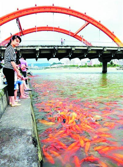 無序放生導(dǎo)致鯉魚泛濫,經(jīng)常有浙江和蒼南等地的放生者將動物拿到桐山溪放生,除了魚以外還發(fā)現(xiàn)了龜和蛇等生物,使得溪內(nèi)生物密度過高,生態(tài)遭到破壞。此外,市民經(jīng)常拿食物喂養(yǎng)魚群,使得鯉魚變得異常肥大,不利于魚類的可持續(xù)發(fā)展。我們在溪邊還常常發(fā)現(xiàn)有往溪中扔過期食物和傾倒生活泔水的市民,影響了母親河的水質(zhì)。