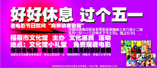 為推動我市公共文化服務(wù)體系建設(shè)加快,加大實施“文化惠民”的群眾性工作,福鼎市文化館在2015“五一”期間舉辦“《向勞動者致敬》經(jīng)典老電影節(jié)”播映文化活動,日前引進了一批曾經(jīng)膾炙人口、風(fēng)靡千家萬戶、持續(xù)影響幾代人成長的五十、六十、七十年代國產(chǎn)拍攝的經(jīng)典黑白、彩色電影故事片(相對清晰),計劃在“小長假”期間文化館小禮堂的300英寸高流明工程機播映讓廣大勞動者及市民朋友“追尋那時花開”再一次找到當年記憶中的文化快樂。