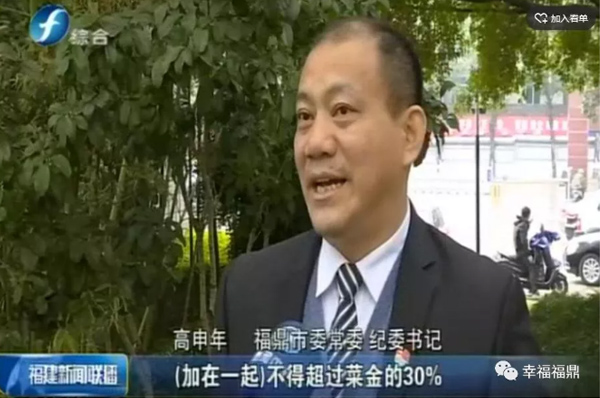 福鼎市委常委、市紀(jì)委書記高申年介紹說:“在菜金方面原來根據(jù)我們了解,大概(每桌)達(dá)到一萬元左右,但今年(2017年)這個(gè)規(guī)定,菜金不得超過2800元每桌,酒水加在一起包括煙等(加在一起)不得超過菜金的30%,那這樣加在一起就是不超過3700元左右?!?