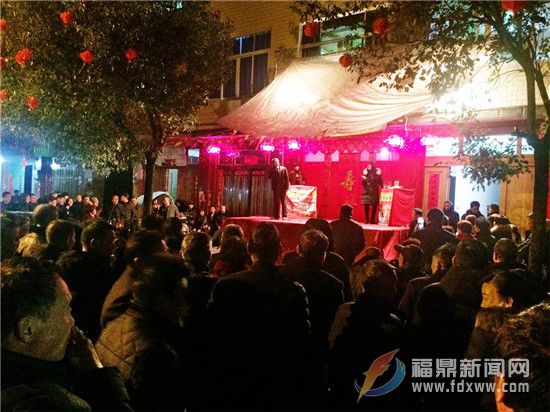 2月9日晚,在點頭鎮(zhèn)文昌社區(qū)的依山街旁,一場溫馨、熱鬧的家庭祝壽活動正在舉行。簡易的小舞臺中央掛著一幅“壽”字掛幅,兩三位當?shù)氐耐┰姼枋终诒硌?。聲聲祝福,濃濃情意,讓兩位老壽星及現(xiàn)場觀眾喜笑顏開,現(xiàn)場歌聲、笑聲、喝彩聲和掌聲此起彼伏,寓教于樂。