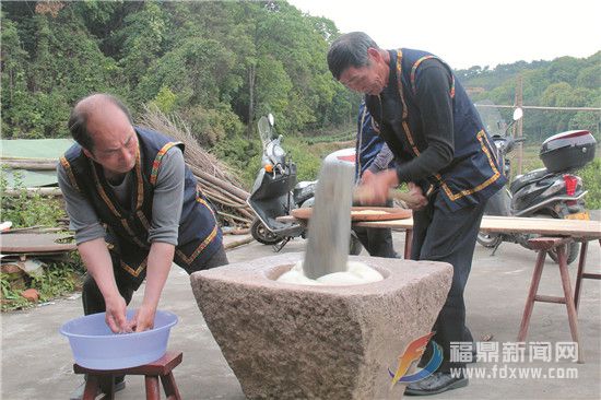 制作白粿一共有八道工序,首先選用上好的晚稻米浸泡,接著是碾米篩粉的細活兒等等。其中最重要的就是蒸粉,火候太早了制作會很吃力,太軟則白粿難以成型。最后是舂米(粉)和做年糕,然后一條條熱氣騰騰的白粿就成型了。