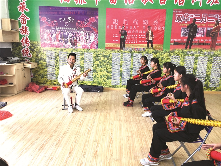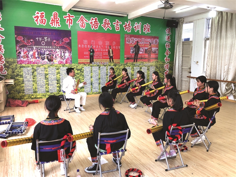 在嘭嘭鼓說唱藝人林祥本的帶領下,十名身著畬族服飾的初一女生,有板有眼地跟唱《十二月采茶詩》。只見她們右手擊鼓,發(fā)出嘭嘭的鼓聲;左手持板,發(fā)出噠噠的竹板聲。采茶故事就在鼓聲和竹板聲的輕快節(jié)奏中娓娓道來。