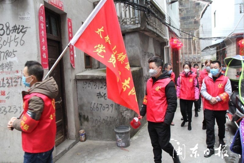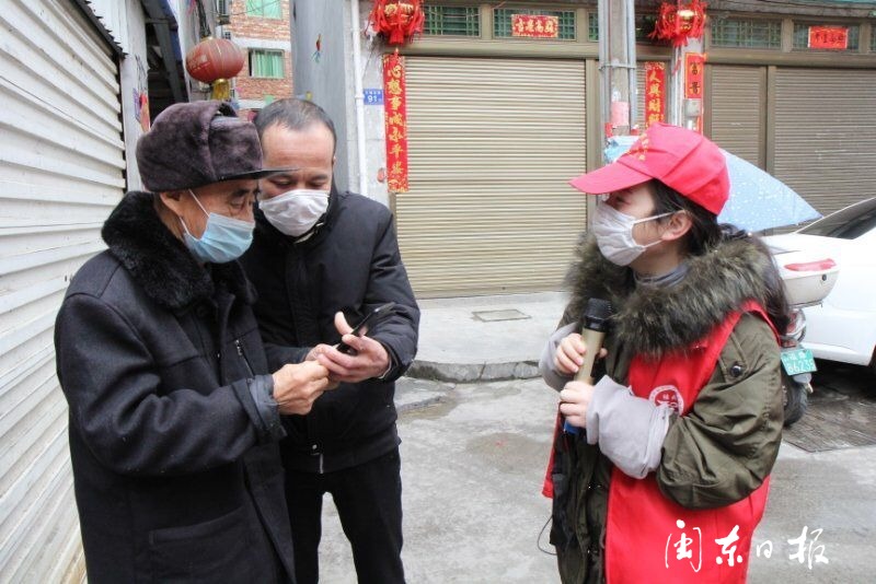 “各位阿公阿婆、叔叔伯伯、阿姑阿姨,過年好......”“鐺——”“溫州疫情蠻嚴(yán)重,疫情期間不接待,見面拜年手機(jī)代,微信紅包也實(shí)在,親友暫時(shí)莫來去,居家防護(hù)要做到,走訪溫州都取消,疫情結(jié)束再碰面......”“鐺——”2月8日,福鼎市太姥山鎮(zhèn)黨委宣傳委員吳潔昀帶領(lǐng)所包社區(qū)的兩委、黨員志愿者,戴著口罩、拿著喇叭和小鑼,走街串巷,宣傳防疫知識(shí),勸導(dǎo)群眾不出門。