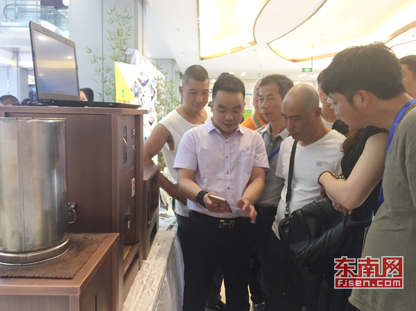 在現(xiàn)場“制茶”展示區(qū),現(xiàn)場擺放了三個古銅色的現(xiàn)代化制茶設備,三四名工作人員正在不停歇地招待著圍觀的茶客。工作人員首先取出適量曬青茶葉,其次將茶葉放入蒸茶機里進行、熏蒸,讓茶葉經(jīng)過蒸汽迅速變軟,以備下一步“做型”;第三步,將蒸好的茶葉放入制“餅”機里,在壓制模具內進行、壓制成型,做成圓餅狀;第四步,將茶餅放入干燥機內,進行低溫、干燥,增進品質;最后通過手機掃一個自己喜歡的二維碼圖案,通過打印機打印出、包裝,一個屬于自己專屬訂制的福鼎白茶餅就面世了。