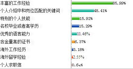 前程無憂論壇“HR聚會所”部落就“簡歷中最能打動HR的因素”發(fā)起了網(wǎng)上調查,調查結果顯示,“豐富的工作經(jīng)驗”以遙遙領先的百分比不出意外地成為HR最為看重的簡歷中因素。排在第二位的是“個人簡介中和崗位匹配的關鍵詞”,排在第三位的是“特別的個人技能”,“名校或者高學歷”緊隨其后,排在第五位的是“優(yōu)秀的語言能力”。