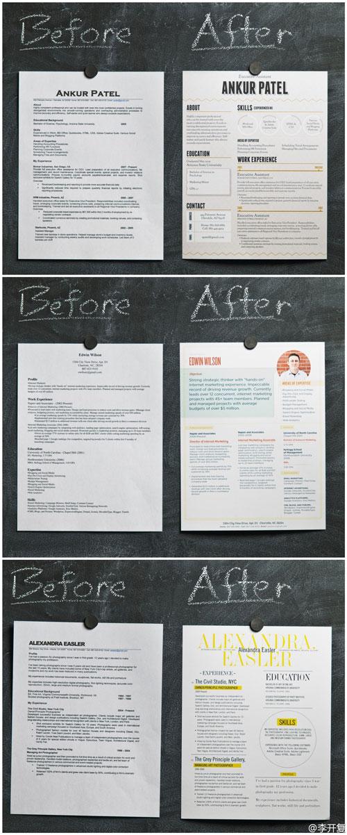 其中一組對(duì)比照,修改前的簡(jiǎn)歷,頂頭處求職者按常規(guī)的方式打出自己的名字,接下來(lái)的關(guān)于求職者的相關(guān)信息非常“中規(guī)中矩”,毫無(wú)特色。